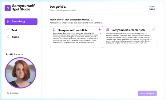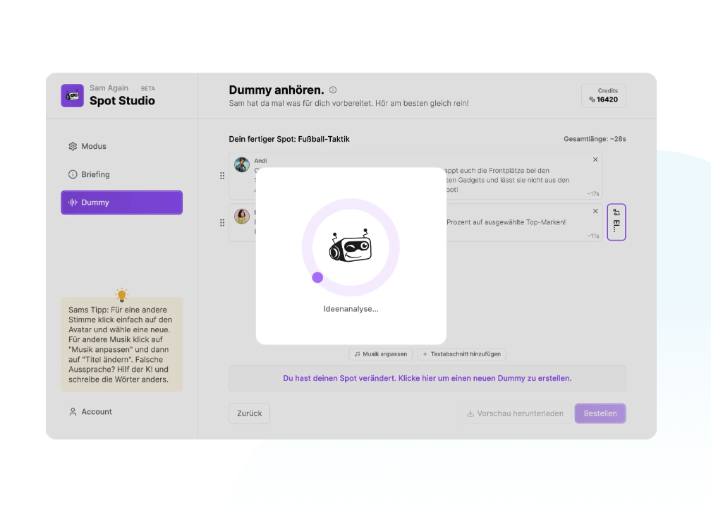 Nutze die Technik von samagain.de, dem automatisierten Audiospotproduktionstool. Du bekommst deinen eigenen Sam mit der gleichen Technik, die hinter Sam Again steckt. Der Betrieb ist für dich kostenlos, du zahlst nur geringe Gebühren anteilig am Verkauf. Die Zahlungen laufen online über das System von Shopify. Somit gibt es keine langen Wartezeiten, wie du sie sicher schon zur Genüge kennst. Meld dich jetzt an und erfahre sofort, wenn es losgeht.